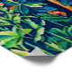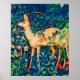 Print in a William Morris tapestry design of deer in a fantasy forest setting - tan speckled deer in a lush, deep blue and green background of leaves and flowers, accented with red tulips