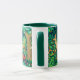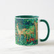 Mug in a William Morris tapestry design of deer in a fantasy forest setting - tan speckled deer in a lush, deep blue and green background of leaves and flowers, accented with red tulips