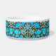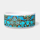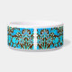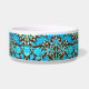 Pet bowl in a vintage William Morris pattern of hyacinths, tulips and leaves, in shades of soft aqua and cerulean blue, accented with coral pink and orange, on a dark chocolate brown background