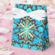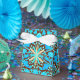 Tent favour box in a vintage William Morris pattern of hyacinths, tulips and leaves, in shades of soft aqua and cerulean blue, accented with coral pink and orange, on a dark chocolate brown background