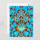 Postcard in a vintage William Morris pattern of hyacinths, tulips and leaves, in shades of soft aqua and cerulean blue, accented with coral pink and orange, on a dark chocolate brown background