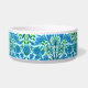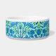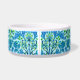 Pet bowl in a vintage William Morris pattern of hyacinths, tulips and leaves, in shades of deep cerulean and cobalt blue, accented with navy, yellow, and lime green, on a pastel sky blue background