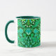 Coffee mug in a vintage William Morris pattern of hyacinths, tulips and leaves, in shades of emerald and jade green, accented with aqua and white, on a deep forest green background
