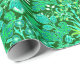 Wrapping paper in a vintage William Morris pattern of hyacinths, tulips and leaves, in shades of emerald and jade green, accented with aqua and white, on a deep forest green background