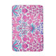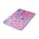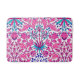Bath mat in a vintage William Morris pattern of hyacinths, tulips and leaves, in shades of fuchsia and soft pink, accented with dark blue and turquoise, on a white background