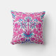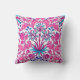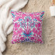 Throw pillow in a vintage William Morris pattern of hyacinths, tulips and leaves, in shades of fuchsia and soft pink, accented with dark blue and turquoise, on a white background