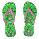 Flip-flops in a vintage William Morris pattern of hyacinths, tulips and leaves, in shades of lime green, accented with fuchsia pink and white, on a deep emerald green background