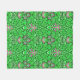 Fleece blanket in a vintage William Morris pattern of hyacinths, tulips and leaves, in shades of lime green, accented with fuchsia pink and white, on a deep emerald green background