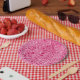 Paper plates in a vintage William Morris, Art Nouveau, print based on the traditional artwork of India, digitally enhanced and coloured, in deep fuchsia pink, on a pastel pink background