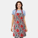 Apron in a vintage William Morris floral print of stylised lilies and Irises, digitally enhanced and coloured, in shades of grey / grey and black foliage, with deep red flowers,on a white background
