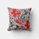 Throw pillow in a vintage William Morris floral print of stylized lilies and Irises, digitally enhanced and colored, in shades of gray / grey and black foliage, with deep red flowers,on a white background