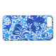 Phone case in a vintage William Morris floral print of stylised lilies and Irises, digitally enhanced and coloured, in shades of deep cobalt blue, cerulean blue, and light sky blue on a white background