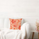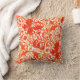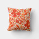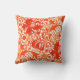 Throw pillow in a vintage William Morris floral print of stylised lilies and Irises, digitally enhanced and coloured, in shades of light to deep Mandarin orange on a white background