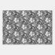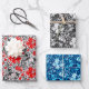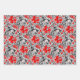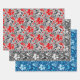 Wrapping paper in a vintage William Morris floral print of stylised lilies and Irises, digitally enhanced and coloured, in shades of grey / grey and black foliage, with deep red flowers, on white, shades of grey / grey and white on black, and shades of sky blue and white on dark indigo blue