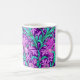 Mug in a William Morris, Art Nouveau, textile print of irises and leaves, digitally enhanced and coloured, in soft orchid and turquoise, on a deep amethyst purple background