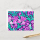 Postcard in a William Morris, Art Nouveau, textile print of irises and leaves, digitally enhanced and coloured, in soft orchid and turquoise, on a deep amethyst purple background