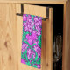 Kitchen towel in a William Morris, Art Nouveau, textile print of irises and leaves, digitally enhanced and coloured, in soft orchid and turquoise, on a deep amethyst purple background