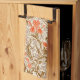 Kitchen towel in a William Morris, Art Nouveau, textile print of irises and leaves, digitally enhanced and colored, in coral orange, with coffee brown and taupe tan leaves, on a beige background