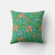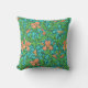 Pillow in a William Morris, Art Nouveau, textile print of irises and leaves, digitally enhanced and coloured, in mandarin orange, lime green, and soft aqua, on a deep turquoise / teal background