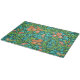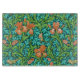 Cutting Board in a William Morris, Art Nouveau, textile print of irises and leaves, digitally enhanced and coloured, in mandarin orange, lime green, and soft aqua, on a deep turquoise / teal background