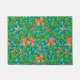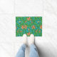 Doormat in a William Morris, Art Nouveau, textile print of irises and leaves, digitally enhanced and colored, in mandarin orange, lime green, and soft aqua, on a deep turquoise / teal background