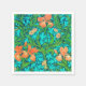 Paper napkins in a William Morris, Art Nouveau, textile print of irises and leaves, digitally enhanced and coloured, in orange, lime green, and soft aqua, on a deep turquoise background