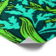 Print in a William Morris, Art Nouveau, textile print of irises and leaves, digitally enhanced and coloured, in orange, lime green, and soft aqua, on a deep turquoise background