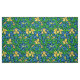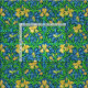 Fabric in a William Morris, Art Nouveau, textile print of irises and leaves, digitally enhanced and coloured, in golden yellow, green, and soft blue, on a deep cobalt blue background