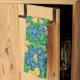 Kitchen towel in a William Morris, Art Nouveau, textile print of irises and leaves, digitally enhanced and coloured, in golden yellow, green, and soft blue, on a deep cobalt blue background