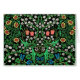 Note card in a vintage William Morris Jacobean floral wallpaper pattern of coral pink tulips, yellow daisies, blue violets, delicate white blossoms, and jade green foliage, on a black background, digitally enhanced and coloured