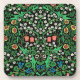 Coasters in a vintage William Morris Jacobean floral wallpaper pattern of coral pink tulips, yellow daisies, blue violets, delicate white blossoms, and jade green foliage, on a black background, digitally enhanced and coloured