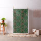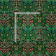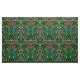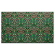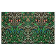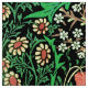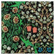 Fabric in a vintage William Morris Jacobean floral wallpaper pattern of coral pink tulips, yellow daisies, blue violets, delicate white blossoms, and jade green foliage, on a black background, digitally enhanced and coloured