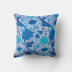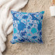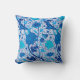 Throw pillow in a William Morris, Art Nouveau, textile pattern - elegant, stylised, chrysanthemums, sunflowers and leaves, in shades of turquoise, cobalt, and navy blue, on a white background