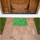 Doormat in a William Morris Art Nouveau textile pattern of lychee tree branches and leaves, in shades of lime and deep green, accented with red lychee fruits and yellow blossoms, on a light green background