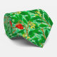 Tie in a William Morris Art Nouveau textile pattern of lychee tree branches and leaves, in shades of lime and deep green, accented with red lychee fruits and yellow blossoms, on a light green background