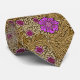 Tie in a vintage William Morris, Art Nouveau, marigold damask print of leaves and flowers, digitally enhanced and coloured, in shades of light brown and beige, accented with violet purple and pink, on a dark chocolate brown background