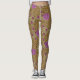 Leggings in a vintage William Morris, Art Nouveau, marigold damask print of leaves and flowers, digitally enhanced and coloured, in shades of light brown and beige, accented with violet purple and pink, on a dark chocolate brown background