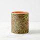Mug in a vintage William Morris, Art Nouveau, marigold damask print of leaves and flowers, in shades of copper brown and mustard gold, accented with orange and yellow, on a dark chocolate brown background
