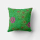 Throw pillow in a vintage William Morris, Art Nouveau, marigold damask print of leaves and flowers, digitally enhanced and coloured, in deep emerald and lime green, accented with fuchsia pink and coral orange, on a dark green background