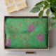 Tissue paper in a vintage William Morris, Art Nouveau, marigold damask print of leaves and flowers, digitally enhanced and coloured, in deep emerald and lime green, accented with fuchsia pink and coral orange, on a dark green background