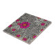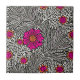 Ceramic tile in a vintage William Morris, Art Nouveau, marigold damask print of leaves and flowers, digitally enhanced and coloured, in shades of grey / grey and white, accented with fuchsia pink and coral orange, on a dark graphite grey background