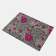 Doormat in a vintage William Morris, Art Nouveau, marigold damask print of leaves and flowers, digitally enhanced and coloured, in shades of grey / grey and white, accented with fuchsia pink and coral orange, on a dark graphite grey background