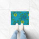 Doormat in a vintage William Morris, Art Nouveau, marigold damask print of leaves and flowers, digitally enhanced and coloured, in shades of turquoise, aqua, and cobalt blue, accented with yellow and lime green, on a dark navy blue background