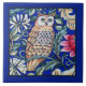 Ceramic tile in a William Morris Art Nouveau, tapestry pattern, featuring a tan and beige owl against fantasy flowers and leaves, with a cobalt blue border