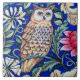 Ceramic tile in a William Morris Art Nouveau, tapestry pattern, featuring a tan and beige owl against fantasy flowers and leaves
