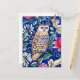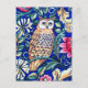 Postcard in a William Morris Art Nouveau, tapestry pattern, featuring a tan and beige owl against fantasy flowers and leaves, with a deep cobalt blue background and border