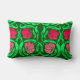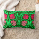 Lumbar pillow in a vintage William Morris textile pattern of stylised pimpernel flowers and leaves - flowers in a gradient of deep to soft coral pink, with light mint green leaves, on a dark emerald green background