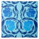 Ceramic tile in a vintage William Morris textile pattern of stylised pimpernel flowers and leaves - flowers in a gradient of light to dark denim blue on a pastel sky blue background