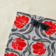 Beach towel in a vintage William Morris textile pattern of stylised pimpernel flowers and leaves - flowers in a gradient of dark to bright red, with graphite grey / grey leaves, on a light silver grey background