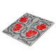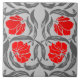 Ceramic tile in a vintage William Morris textile pattern of stylised pimpernel flowers and leaves - flowers in a gradient of dark to bright red, with graphite grey / grey leaves, on a light silver grey background